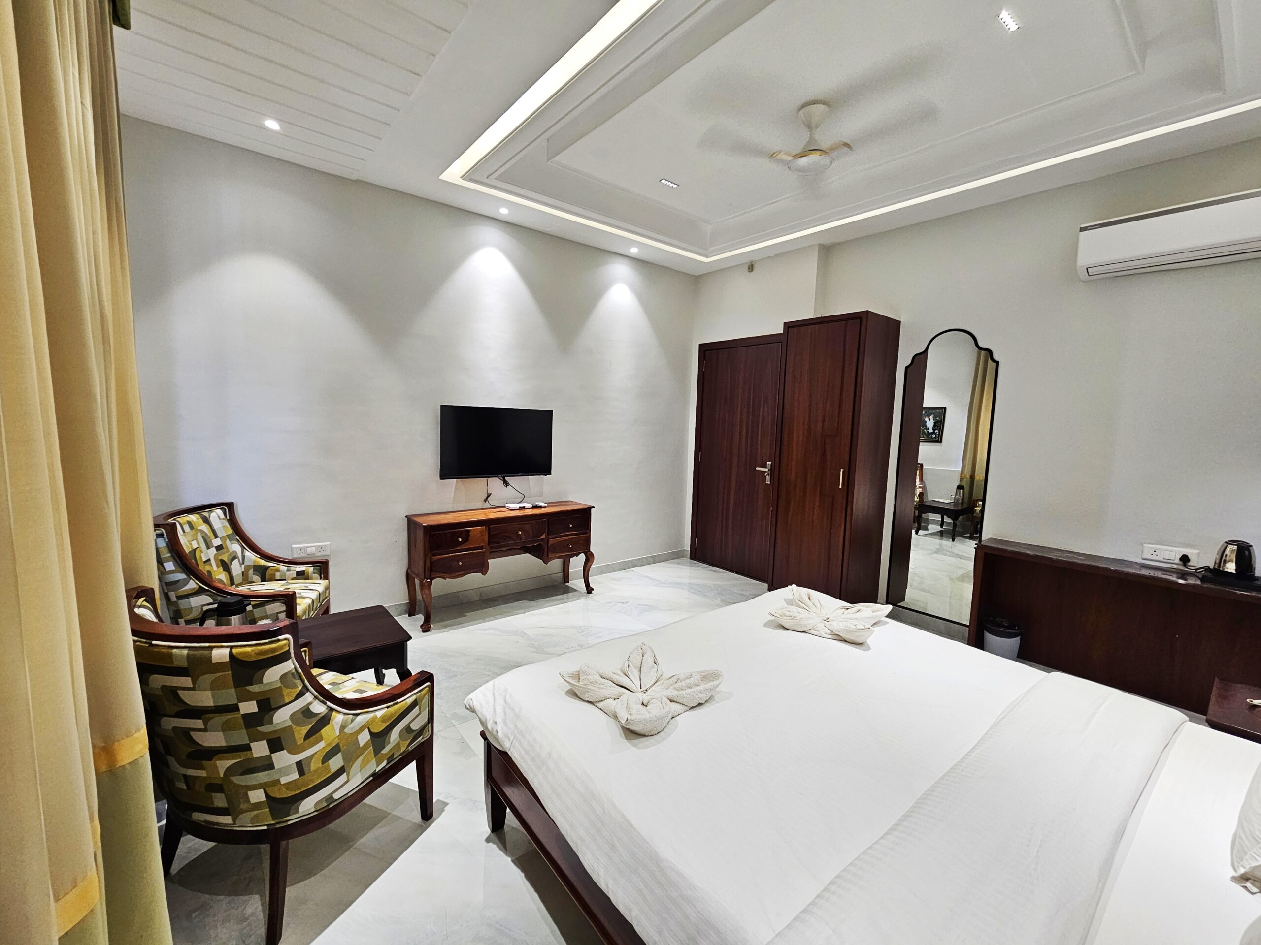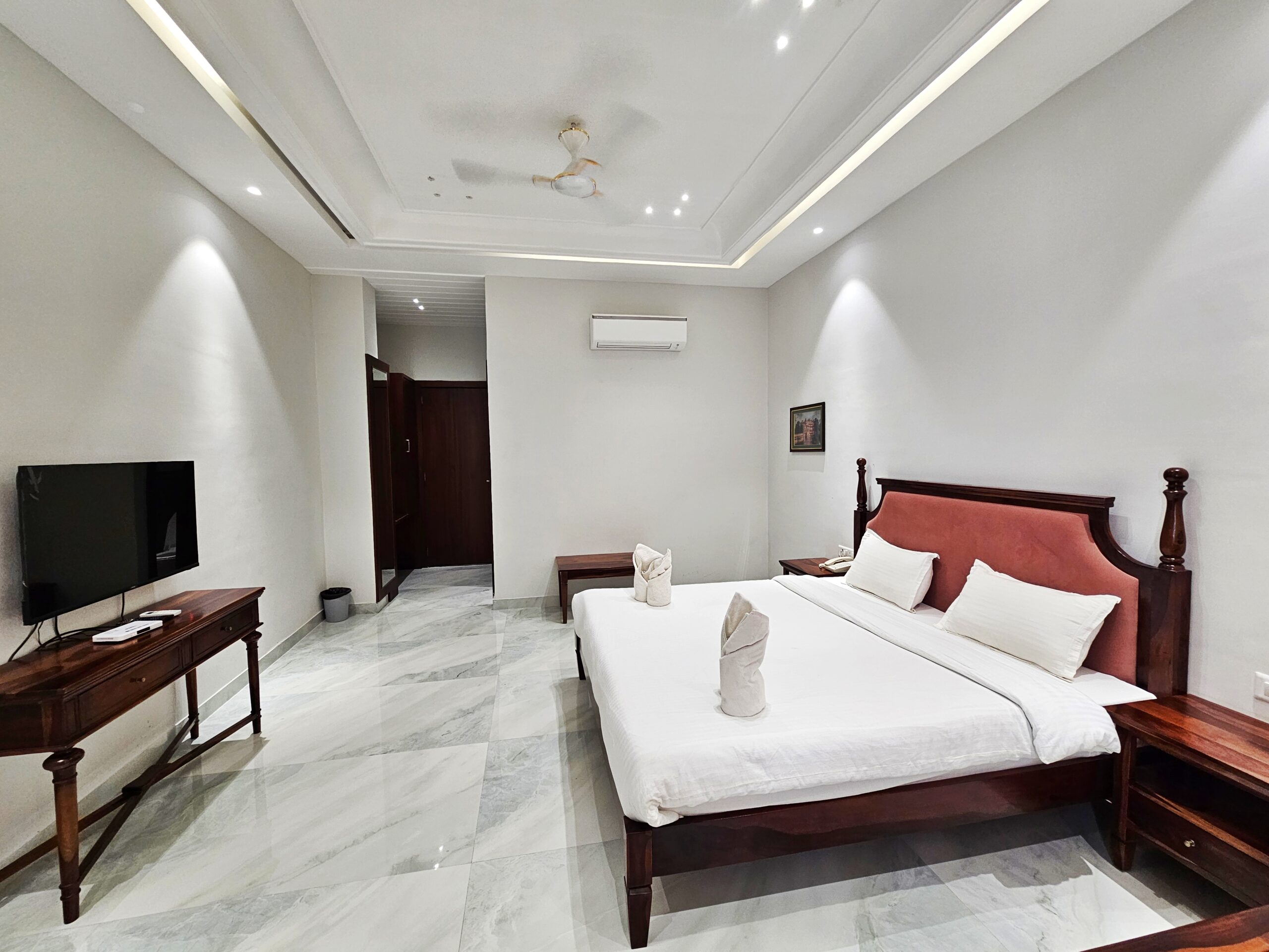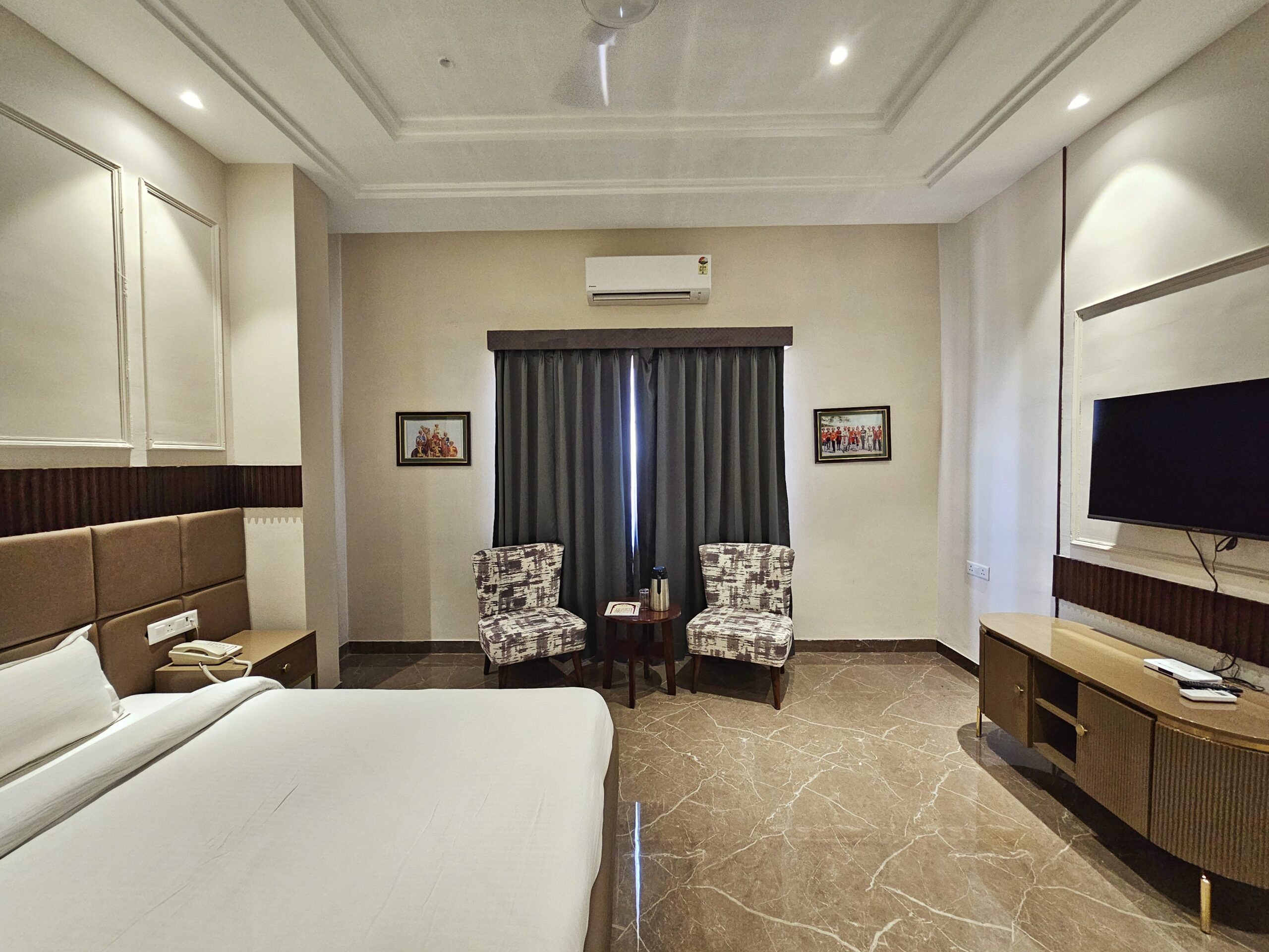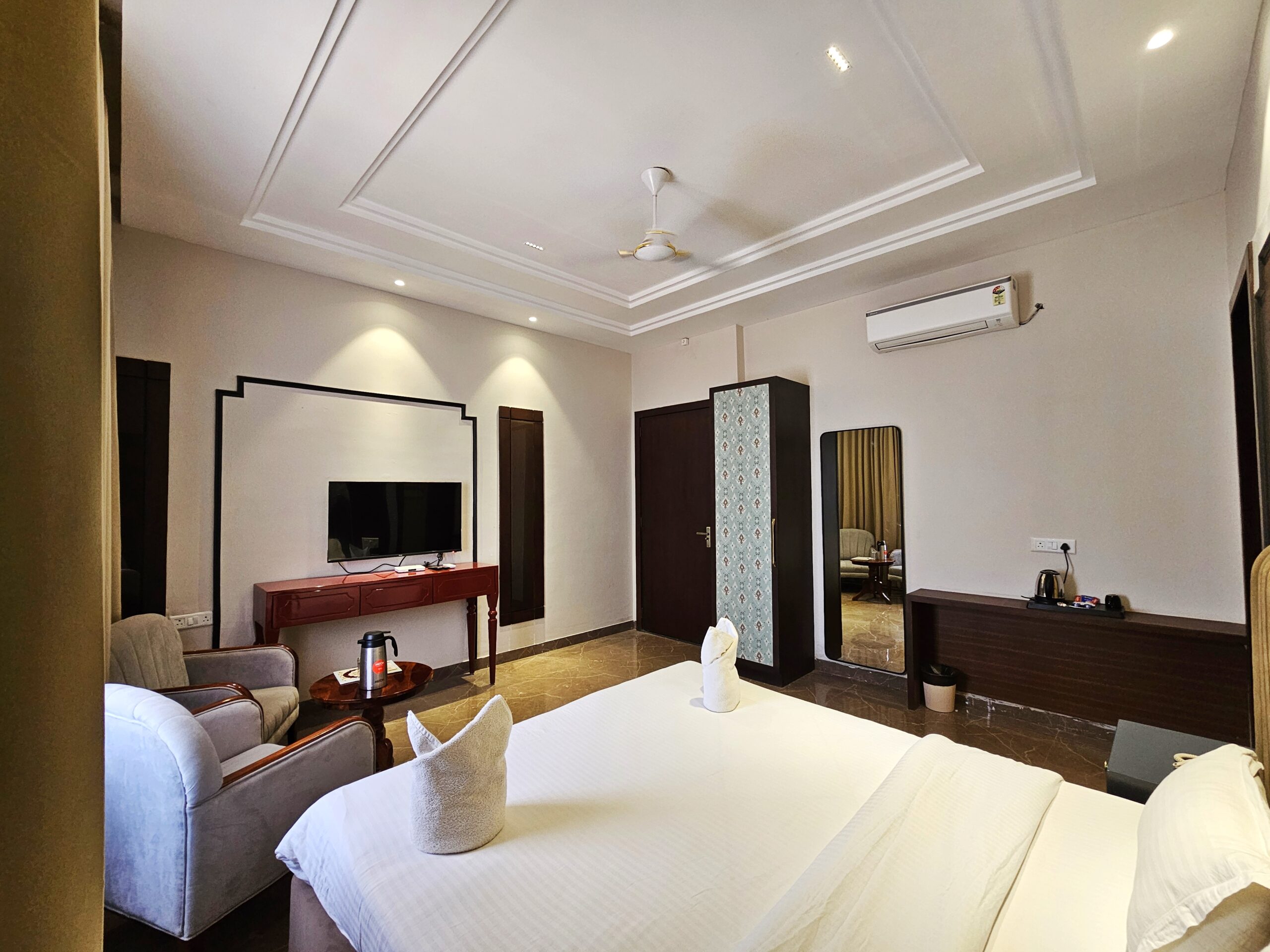 Elegantly designed for comfort and convenience, the Superior Room at Hotel Sagar Haveli is ideal for solo travellers, couples, or small families. With tasteful interiors inspired by the ethnic charm of our golden haveli-style architecture, this room features air conditioning, a private bathroom with complimentary toiletries, and a dedicated work desk. It comfortably sleeps up to 3 guests with a plush double bed. Enjoy seamless connectivity with complimentary high-speed Wi-Fi (25 Mbps or higher) and the assurance of attentive service from our 24-hour front desk. With a total of 35 thoughtfully appointed rooms, free on-site parking, and bilingual staff fluent in English and Hindi, the Superior Room offers a warm, hassle-free stay that makes you feel right at home.
