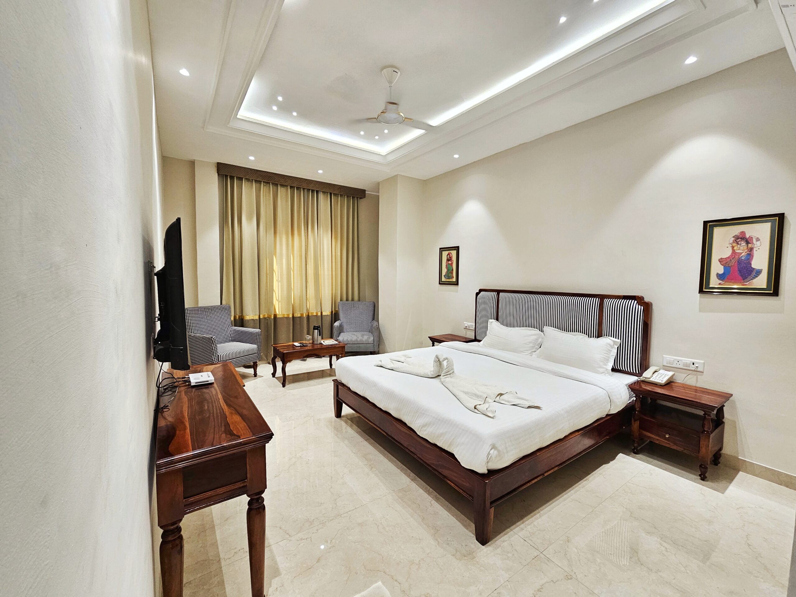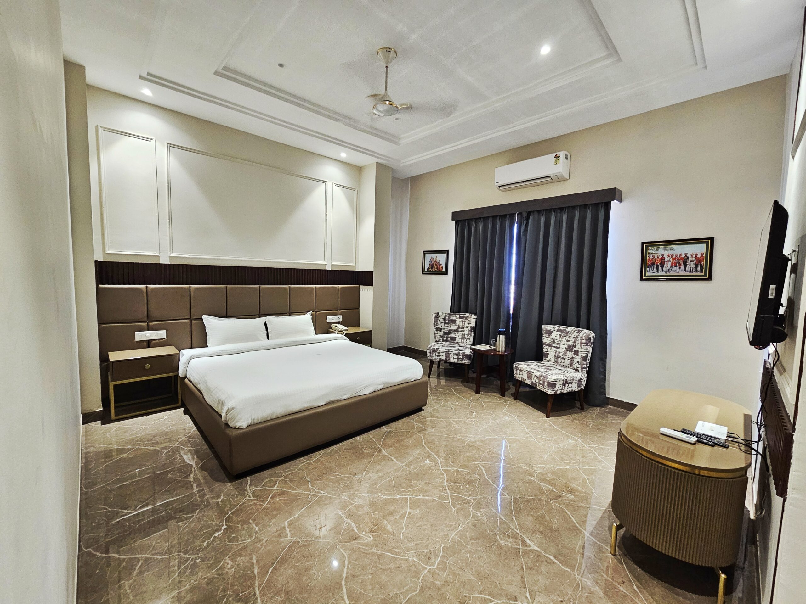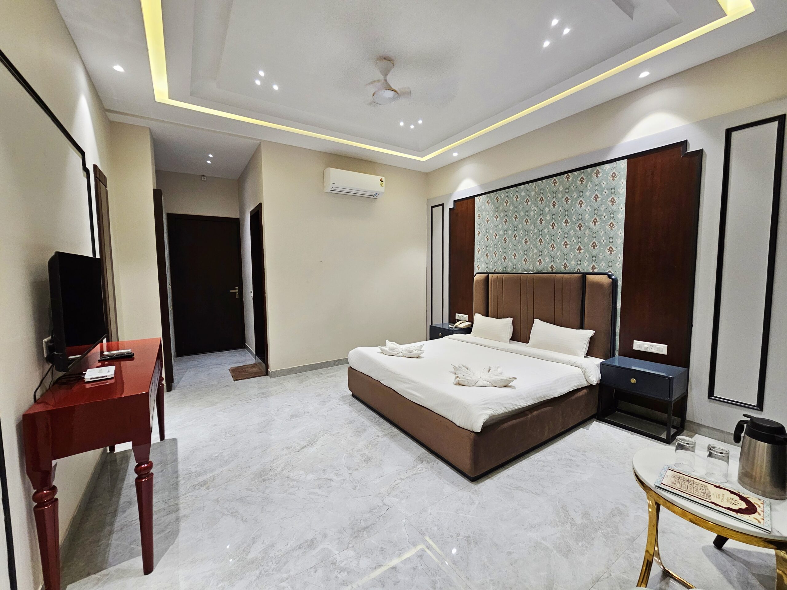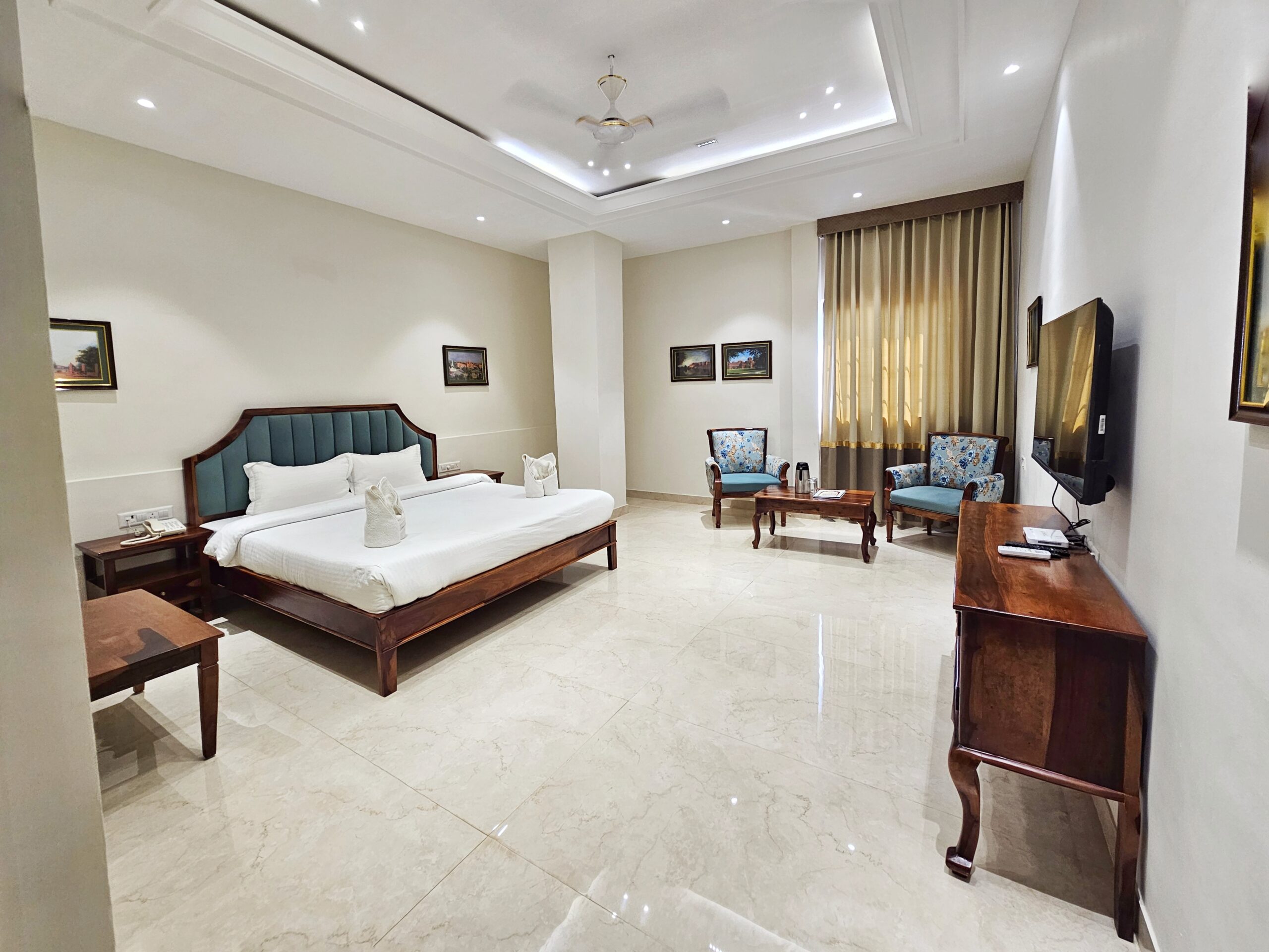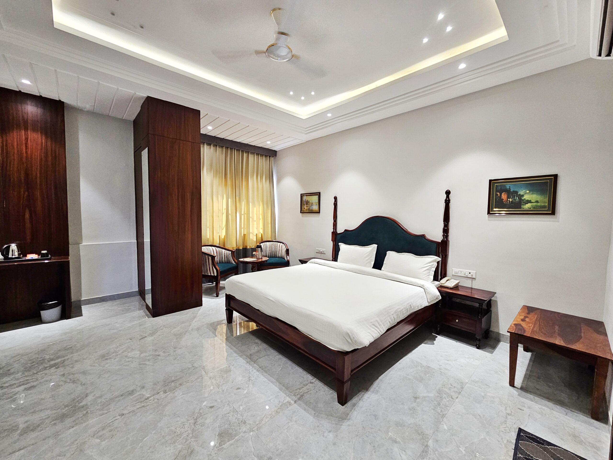 Elegantly designed for comfort and convenience, the Superior Room at Hotel Sagar Haveli is ideal for solo travellers, couples, or small families. With tasteful interiors inspired by the ethnic charm of our golden haveli-style architecture, this room features air conditioning, a private bathroom with complimentary toiletries, and a dedicated work desk. It comfortably sleeps up to 3 guests with a plush double bed. Enjoy seamless connectivity with complimentary high-speed Wi-Fi (25 Mbps or higher) and the assurance of attentive service from our 24-hour front desk. With a total of 35 thoughtfully appointed rooms, free on-site parking, and bilingual staff fluent in English and Hindi, the Superior Room offers a warm, hassle-free stay that makes you feel right at home.