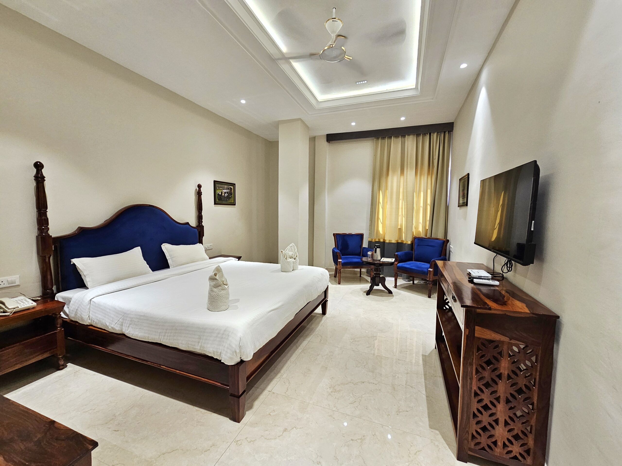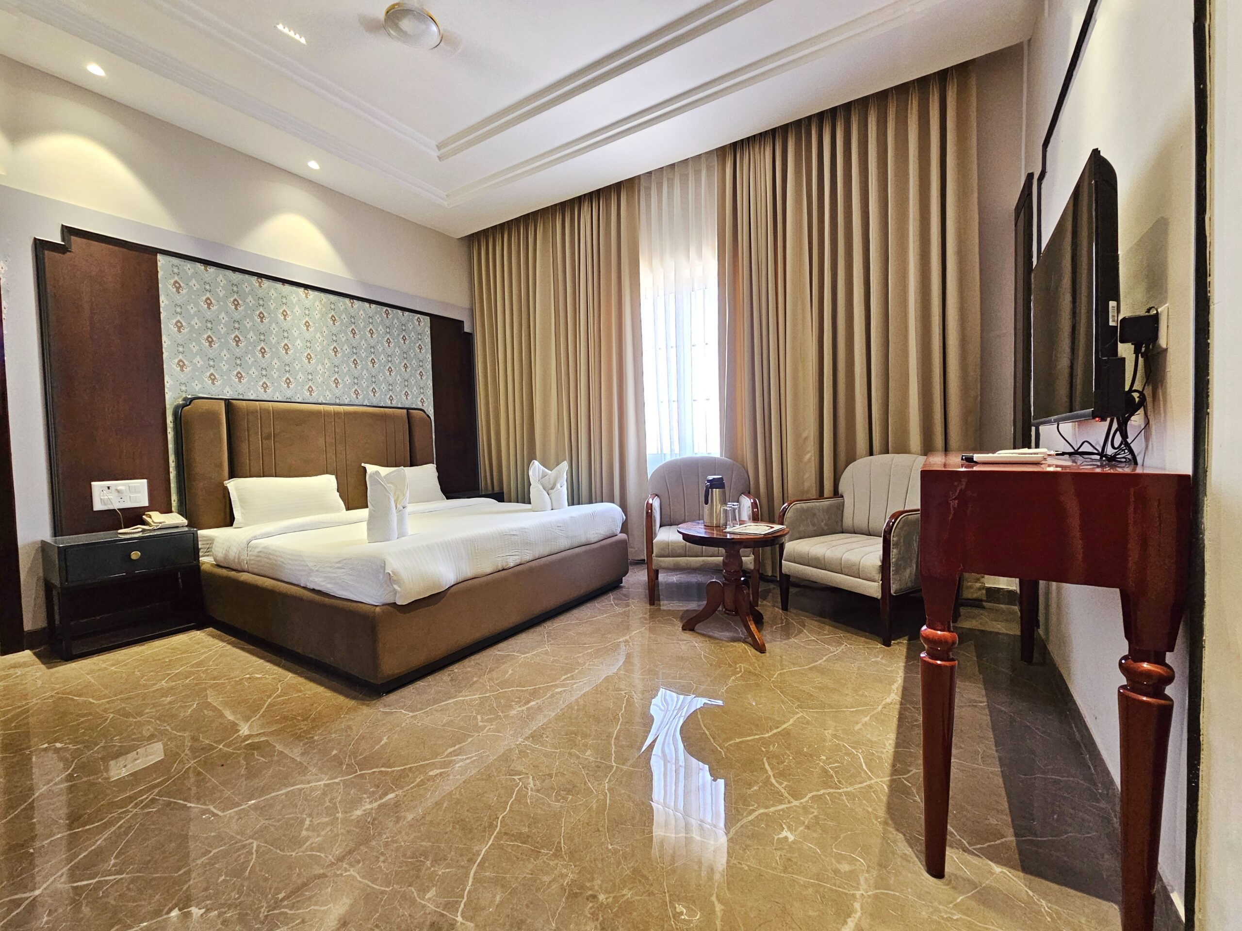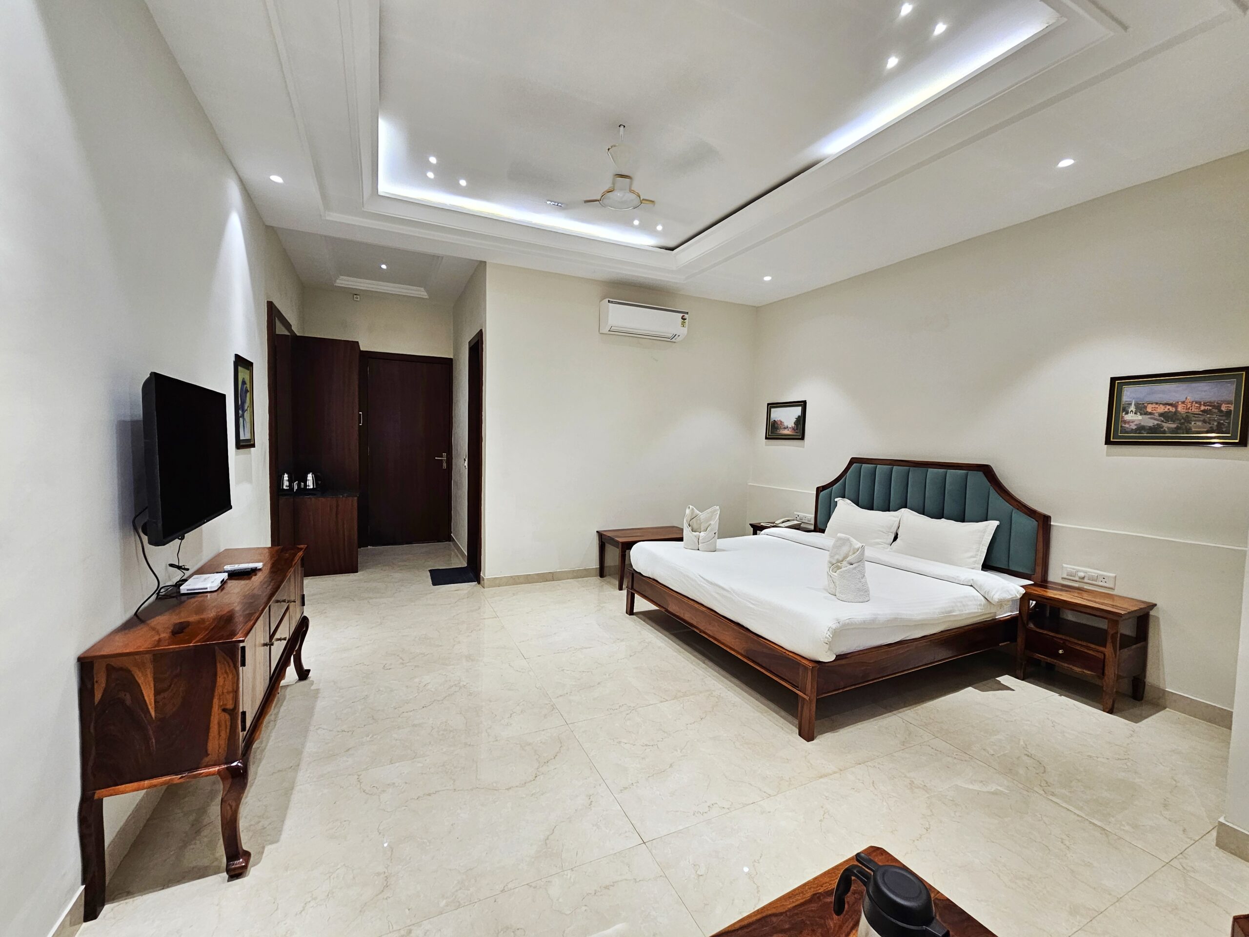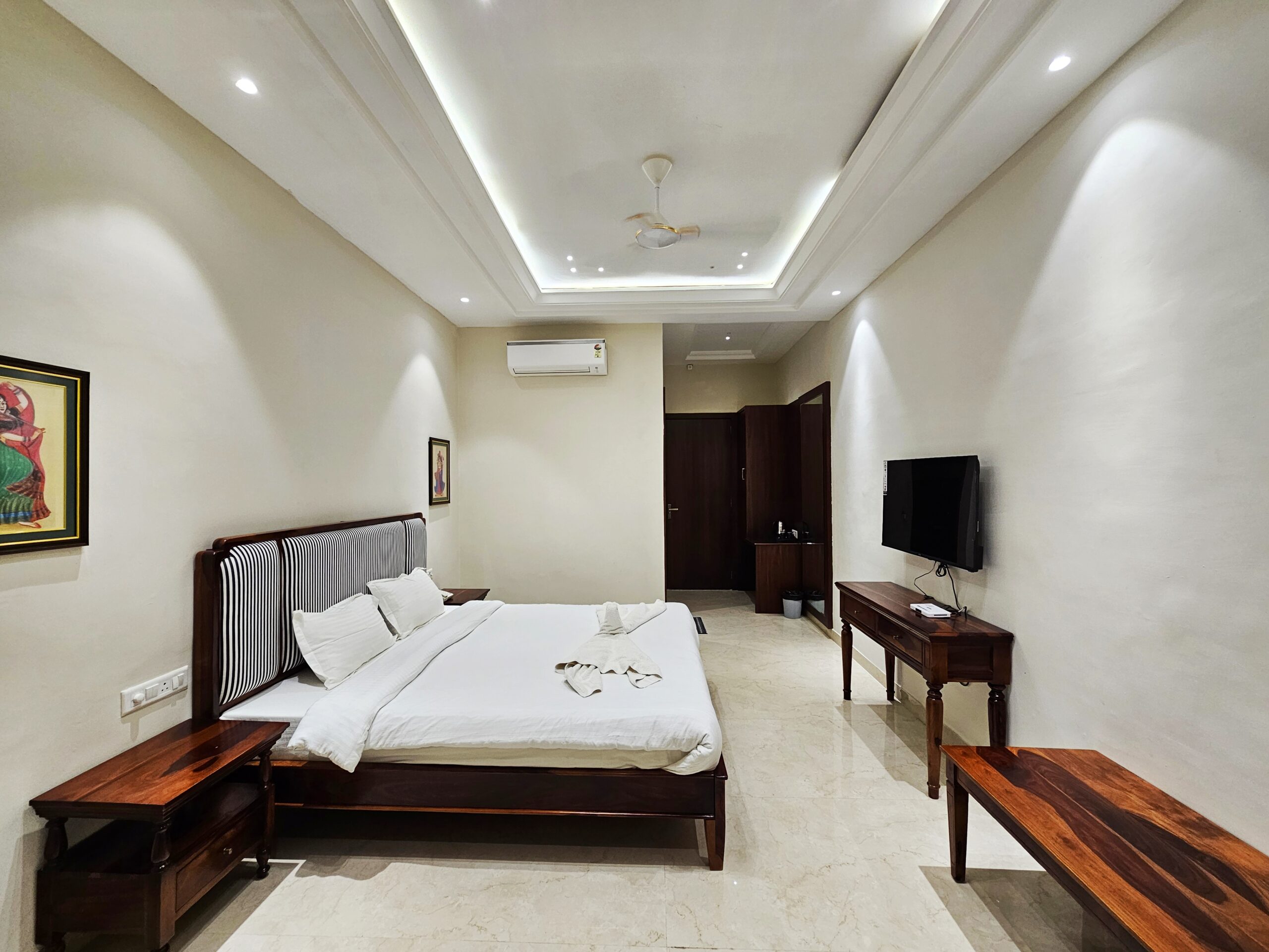 Elegantly designed for comfort and convenience, the Superior Room at Hotel Sagar Haveli is ideal for solo travellers, couples, or small families. With tasteful interiors inspired by the ethnic charm of our golden haveli-style architecture, this room features air conditioning, a private bathroom with complimentary toiletries, and a dedicated work desk. It comfortably sleeps up to 3 guests with a plush double bed. Enjoy seamless connectivity with complimentary high-speed Wi-Fi (25 Mbps or higher) and the assurance of attentive service from our 24-hour front desk. With a total of 35 thoughtfully appointed rooms, free on-site parking, and bilingual staff fluent in English and Hindi, the Superior Room offers a warm, hassle-free stay that makes you feel right at home.